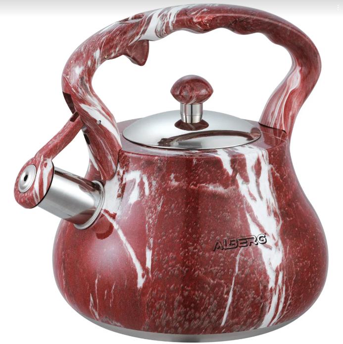 Объем: 2.6 л Свисток с курковым механизмом открывания Нержавеющая сталь 0.6 мм Внешнее глянцевое антипригарное покрытие «Бордовый гранит» Фиксированная ручка Цельнолитой бесшовный корпус Бесшовное индукционное дно Подходит для всех видов плит, включая индукционные