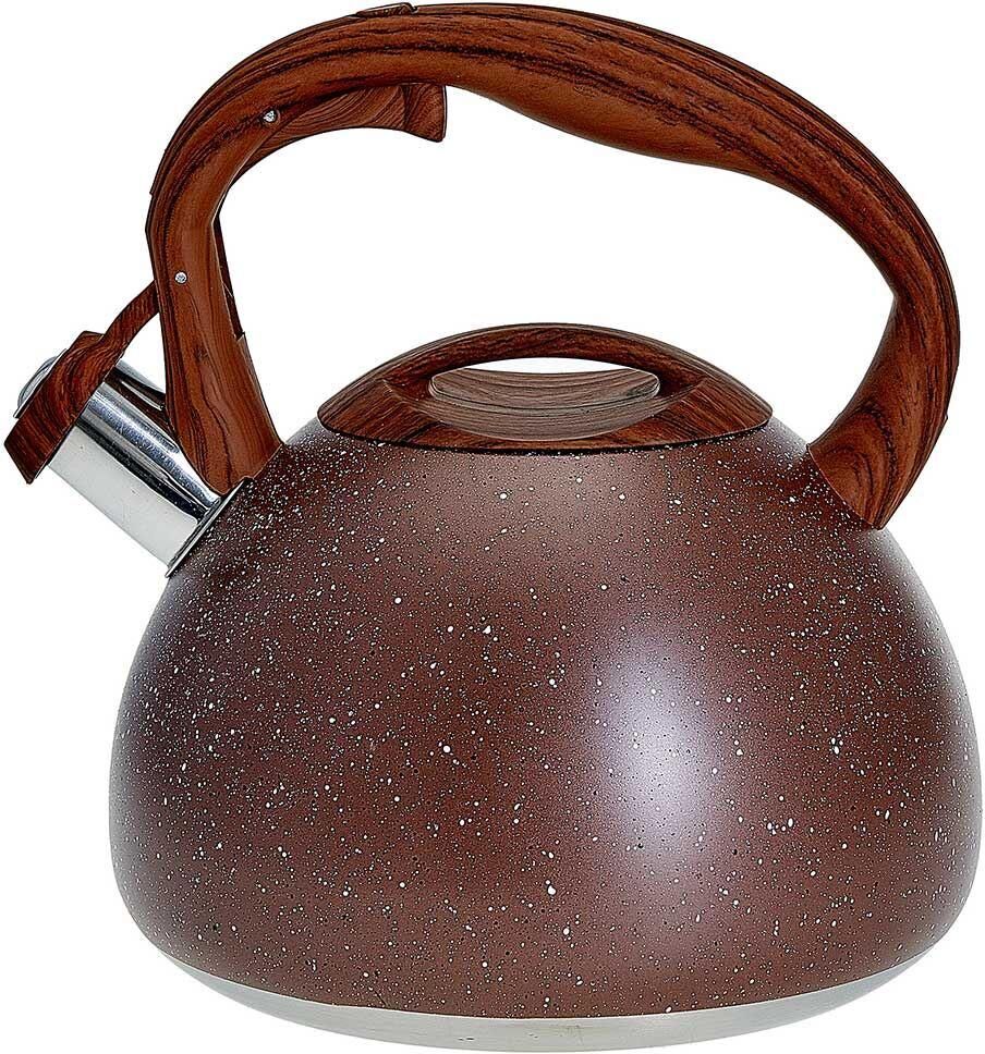 Объем 3 л Толщина стали 0,6 мм Чайник со свистком из высококачественной нержавеющей стали c декоративным покрытием Цвет: коричневый гранит Термосберегающее индукционное дно Термостойкая бакелитовая ручка с противоскользящим покрытием и с кнопкой для открывания носика Цвет ручки: темное дерево Пригоден для использования на всех типах кухонных плит Упаковка: цветная коробка