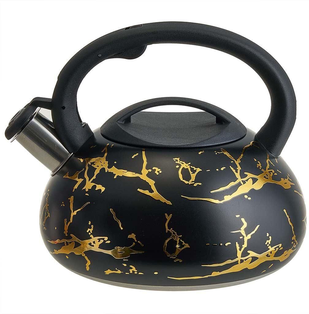 Параметры Объем 3 л Толщина стали 0,6 мм Описание Чайник из нержавеющей стали со свистком Высококачественная нержавеющая сталь c цветным декоративным покрытием, матовая полировка Цвет: черный с золотом Термосберегающее индукционное дно Нейлоновая ручка с кнопкой открывания носика Цвет ручки и крышки: черный Пригоден для использования на всех типах кухонных плит, включая индукционные Упаковка: цветная коробка