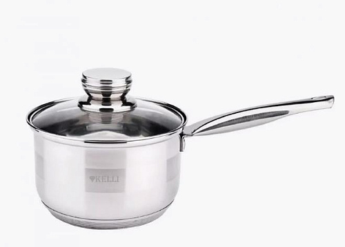 Ковшик из нержавеющей стали с крышкой Объем: 1,3л Размер: 14*8,5 см Высококачественная нержавеющая сталь Капсульное дно. Зеркальная+матовая полировка Стеклянная крышка с паровыпуском Удобная термостойкая клепаная ручка Подходит для всех видов плит