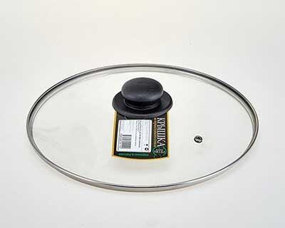 Крышка изготовлена из термостойкого стекла. снабжена пароотводом и имеет металлический обод. Пластиковая ручка на крышке не нагревается, имеет эргономичную форму и не скользит в руке. Можно мыть в посудомоечной машине. Очень удобна в использовании, т.к. позволяет контролировать процесс приготовления пищи не открывая сковородку или кастрюлю. Диаметр 28 см.
