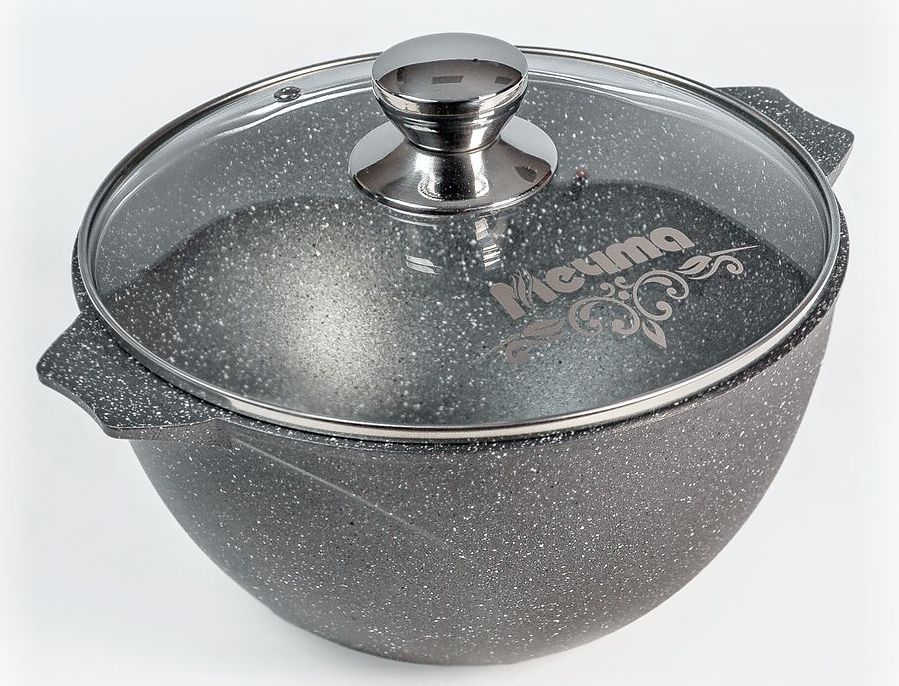 Казан для плова 8л с антипригарным покрытием и стеклянной крышкой серии "Гранит" Подходит для всех типов плит, кроме индукционных. Можно использовать в посудомоечной машине.