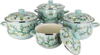 Набор кастрюль VELLEZZA BLUE 8 предметов: 4 эмалированные кастрюли 4 эмалированные крышки Размеры: O 18 h-11.7 см 2.0 л O 22 h-14.2 см 4.5 л O 24 h-15.0 см 5.5 л O 26 h-16.0 см 6.5 л Внутреннее белое эмалевое покрытие Внешнее цветное эмалевое покрытие с декоративным орнаментом Защитный металлический обод вокруг кастрюли Толщина стенок посуды 0.9 мм Удобные полые ручки Цельнолитой бесшовный корпус Подходит для всех видов плит, включая индукционные