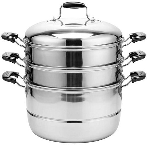Мантоварка Трехуровневая 28 см Высокачественная нержавеющая сталь Утолщенные стенки и дно Зеркальная полировка Ненагревающиеся бакелитовые ручки прозрачная крышка позволяет следить за процессом приготовления Сохраняет все полезные свойства продуктов