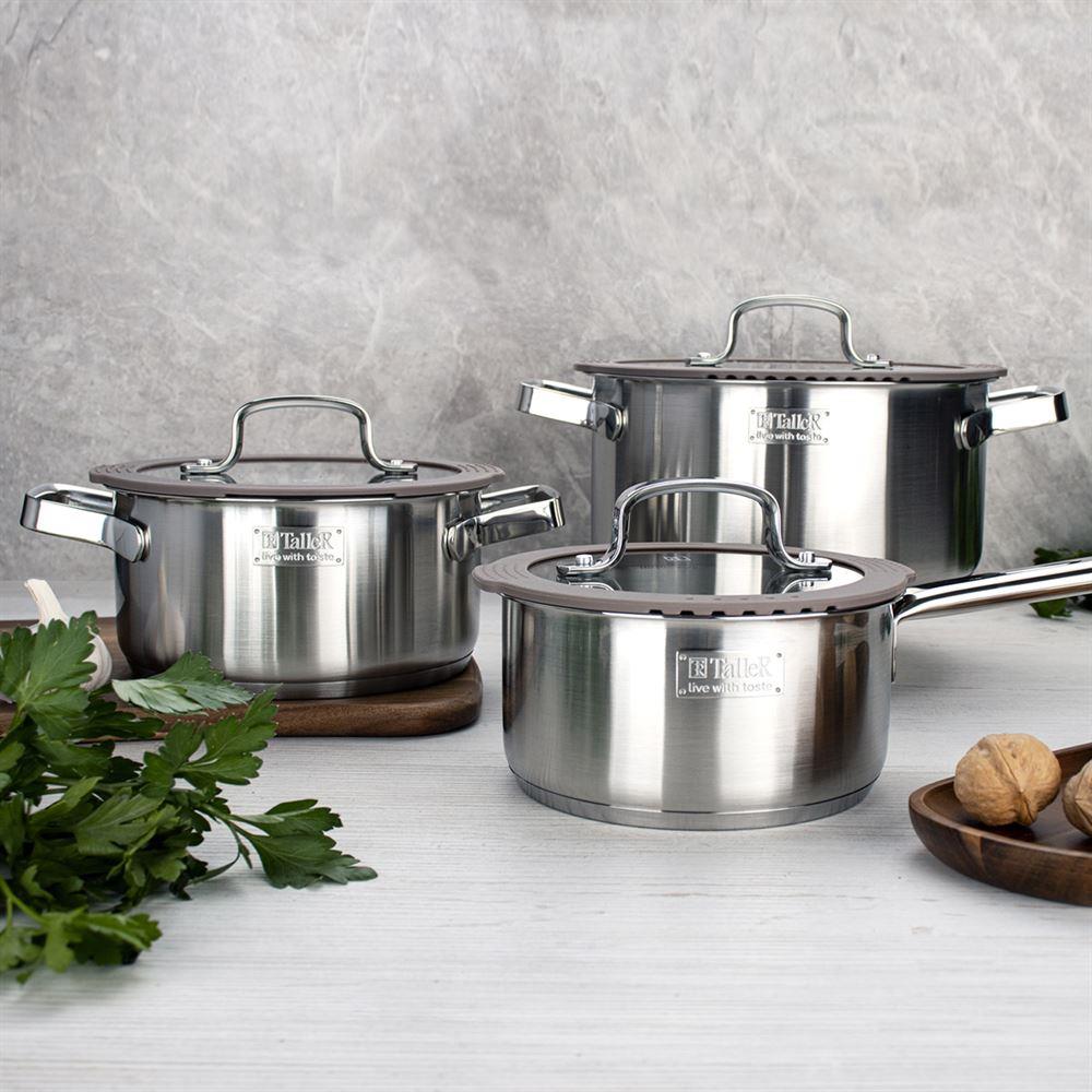 Набор посуды Experience, 6 предметов. Состав набора : кастрюля 3,9 л с крышкой, кастрюля 2,1 л с крышкой, ковш 1,5 л с крышкой Материал: нержавеющая сталь 18/10 Комбинированная крышка из закаленного стекла с силиконовым ободом оригинальной конструкции,