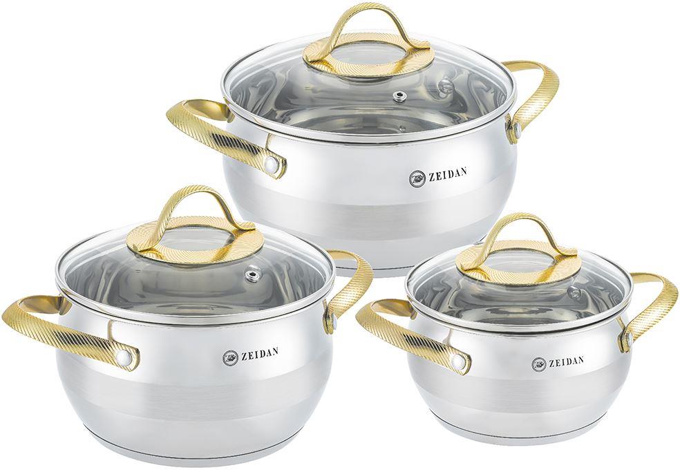 Набор посуды ZEIDAN Z-50667 6 предм. , Набор посуды, 6 предм. (3 КАСТРЮЛИ С КРЫШКАМИ: 1.9 Л (d16 см ), 2.7 Л (d18 см ), 3.6 Л (d20 см ), нержавеющая сталь, 3-х СЛОЙНОЕ КАПСУЛИРОВАННОЕ ДНО, крышки - стекло, ручки «под золото» с декором, внутренняя - зеркальная полировка, снаружи – комбинированная полировка. Подарочная упаковка