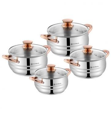 Набор посуды ZEIDAN Z-50817 8 предметов, Набор кастрюль, 8 предм. 4 КАСТРЮЛИ С КРЫШКАМИ: 2.0 Л (d16 см ), 2,7 Л (d18 см ), 3,6 Л (d20 см ), 6,1 Л (d24 см ), нержавеющая сталь, 3-x СЛОЙНОЕ КАПСУЛИРОВАННОЕ ИНДУКЦИОННОЕ ДНО, крышки - стекло, ручки на корпусе и крышке "ПОД ЗОЛОТО", комбинированная полировка снаружи, матовая полировка внутри. Подарочная упаковка.