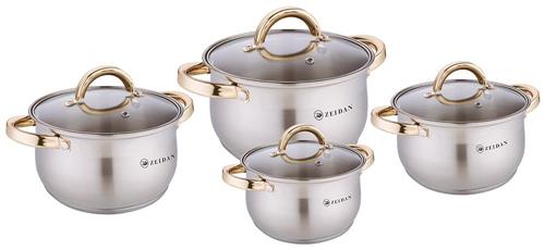 Набор посуды ZEIDAN Z-50821 8 предметов, Набор посуды, 8 предм. (4 КАСТРЮЛИ С КРЫШКАМИ: 4,0 Л (O20 см ), 5,1 Л (O22 см), 6,6 Л (O24 см ), 8,2 Л (O26 см ), нержавеющая сталь, 5-ти СТЕПОВОЕ КАПСУЛИРОВАННОЕ ИНДУКЦИОННОЕ ДНО, крышки - стекло, ручки на корпусе и крышке "ПОД ЗОЛОТО", комбинированная полировка снаружи, матовая полировка внутри. Подарочная упаковка.