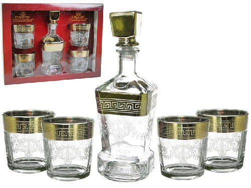 Подарочная упаковка. Стекло с золотым напылением и гравировкой орнаментом "Барокко" В набор входит 1) Бутылка-графин с плотной герметичной пробкой объёмом 500 мл. 2) Стаканы для сока 4шт объёмом 300 мл.